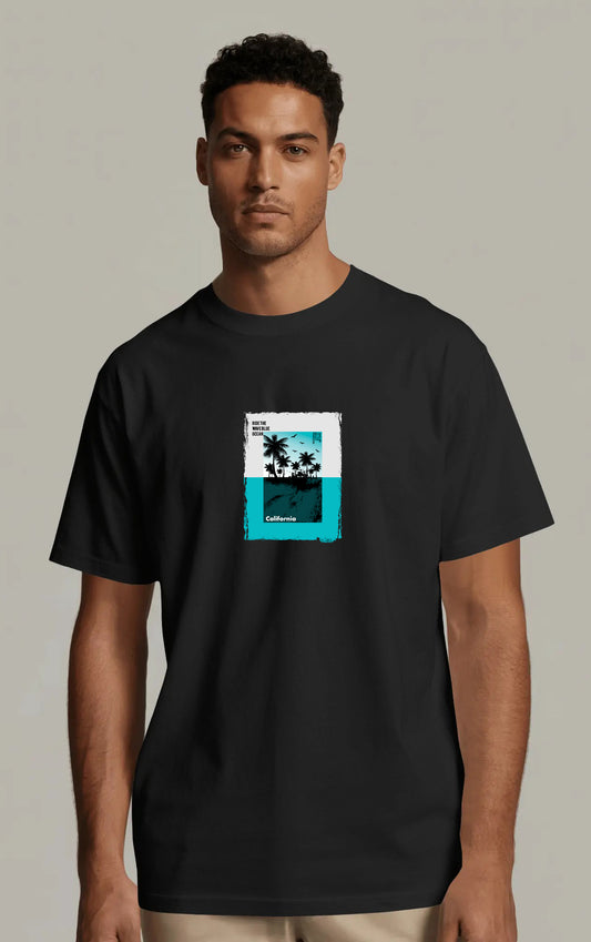 טי שירט חוף קליפורניה – חולצה מודפסת עם דקלים וים